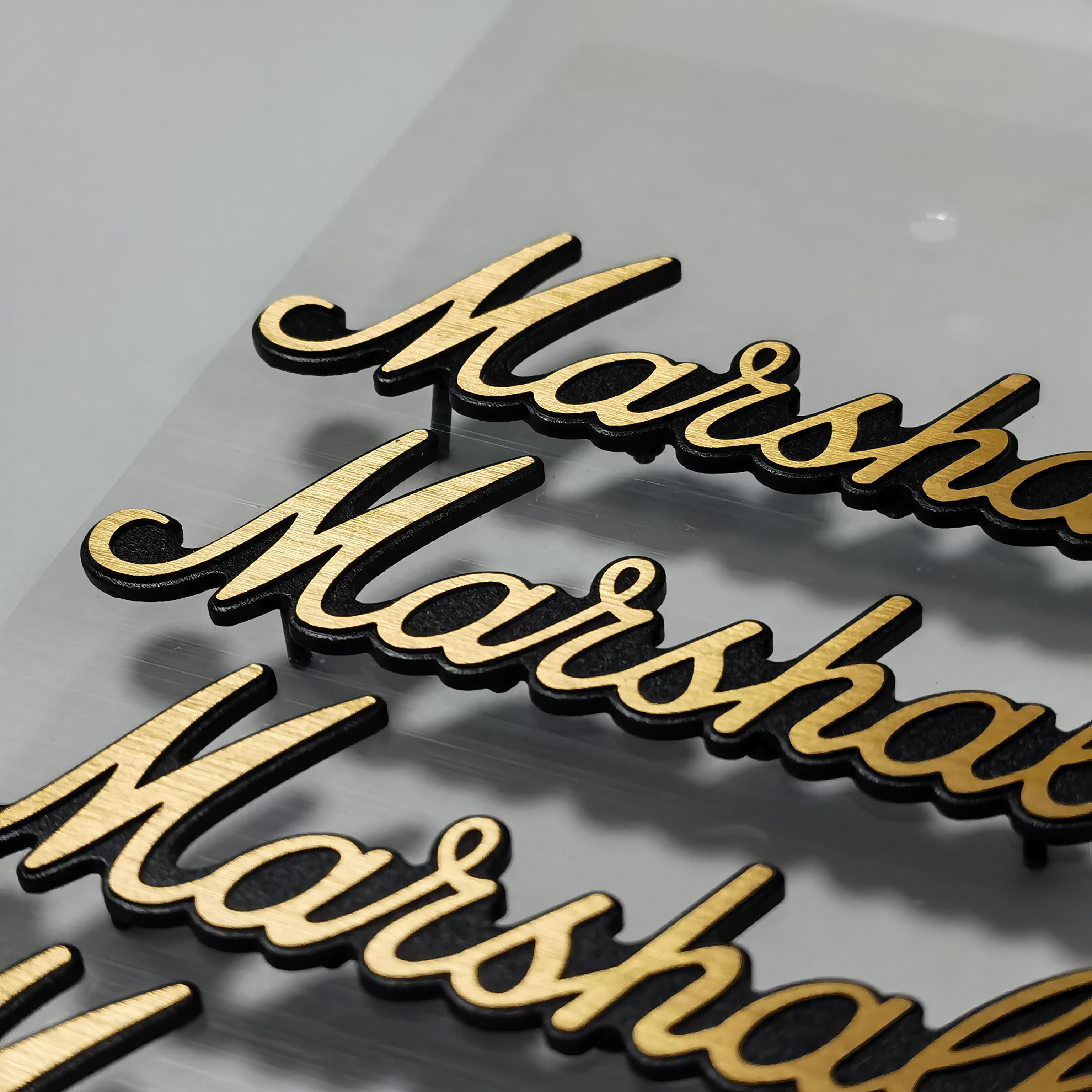 Custom Gold Brushed Logo Shaped Aluminum Label Modern Style with Black Adhesive Backing Metal Nameplate for Foot Column Assembly